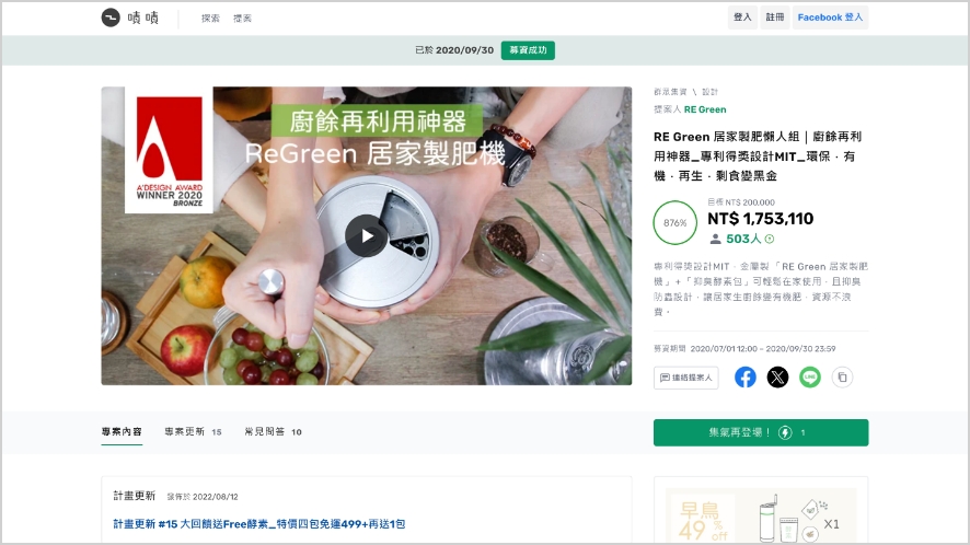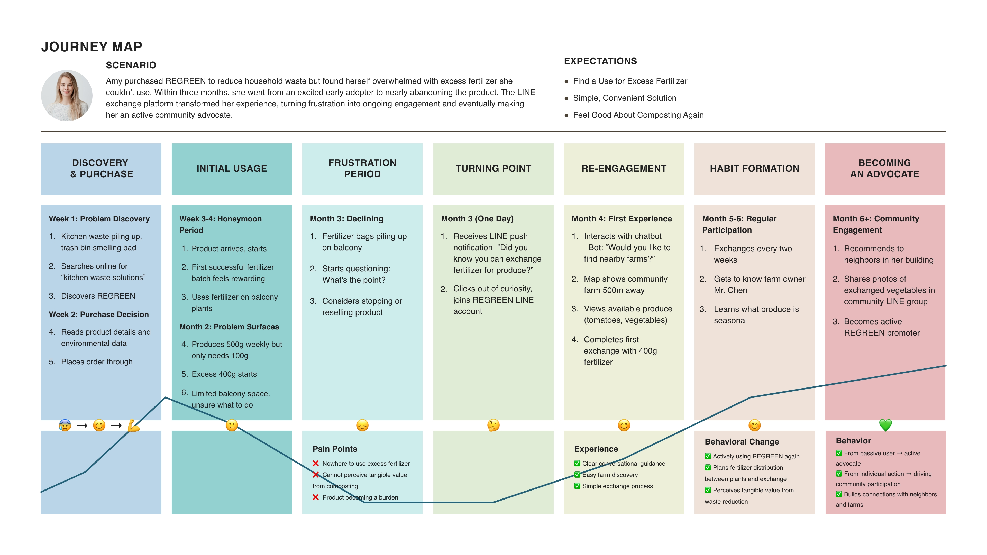 In Taiwan, 40% of trash is kitchen waste, yet the recycling rate has remained below 10% for over a decade. Additionally, the air pollution caused by incinerating kitchen waste poses serious environmental and public health risks. RE GREEN developed an enzyme-based composter that successfully converts kitchen waste into organic fertilizer—but lacked digital infrastructure to reach customers and create lasting engagement. However, the business faced three critical challenges: