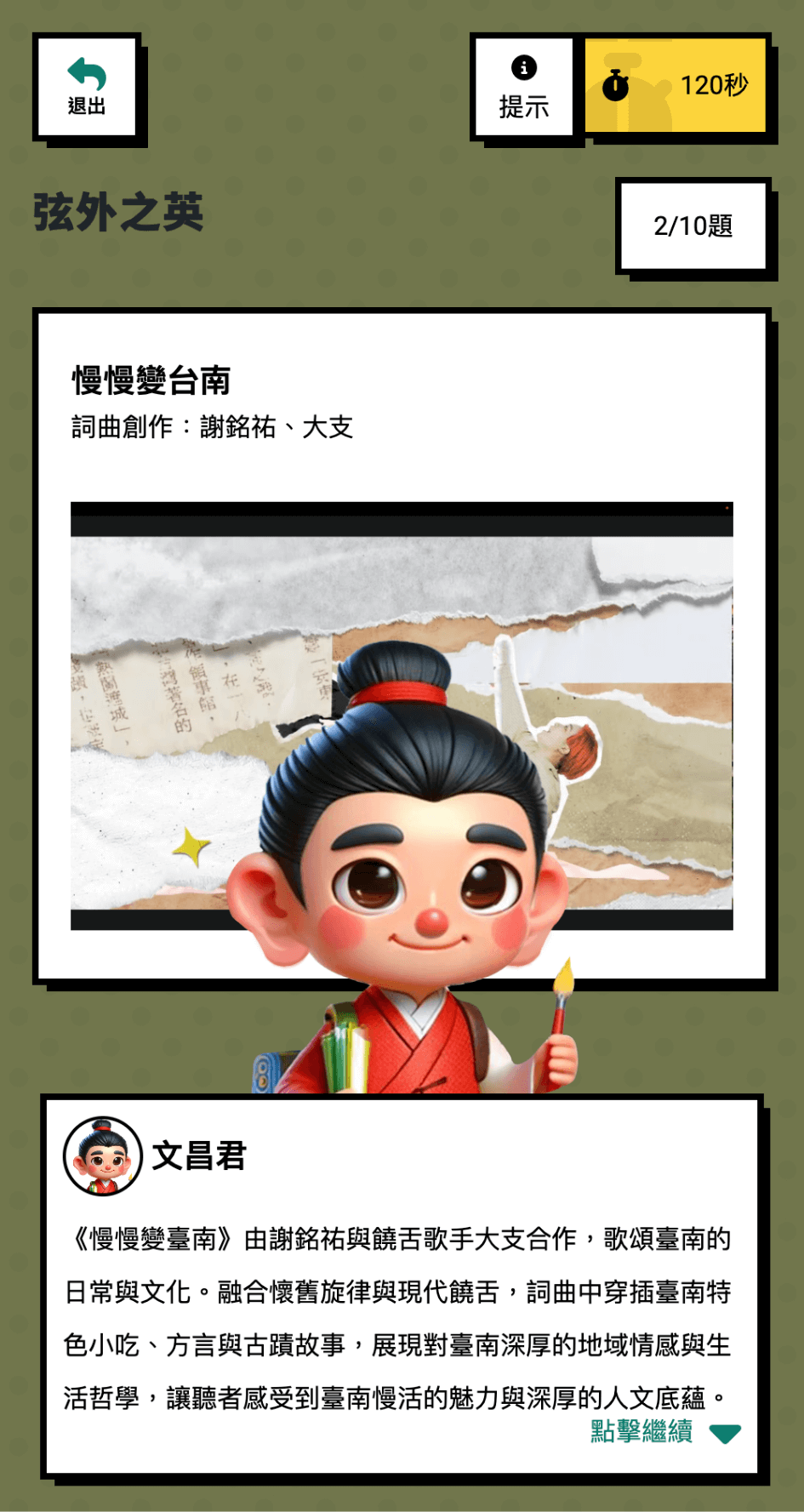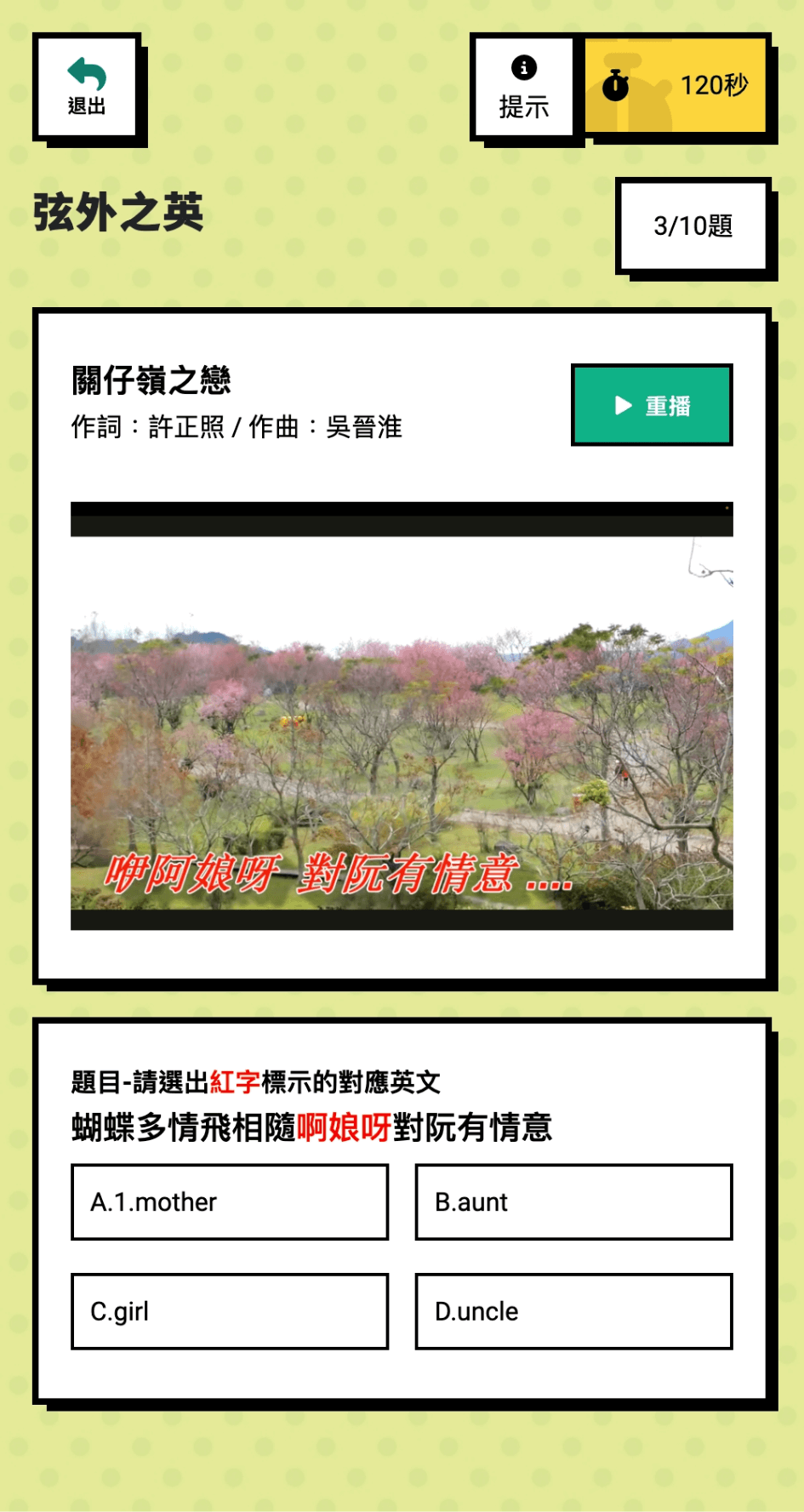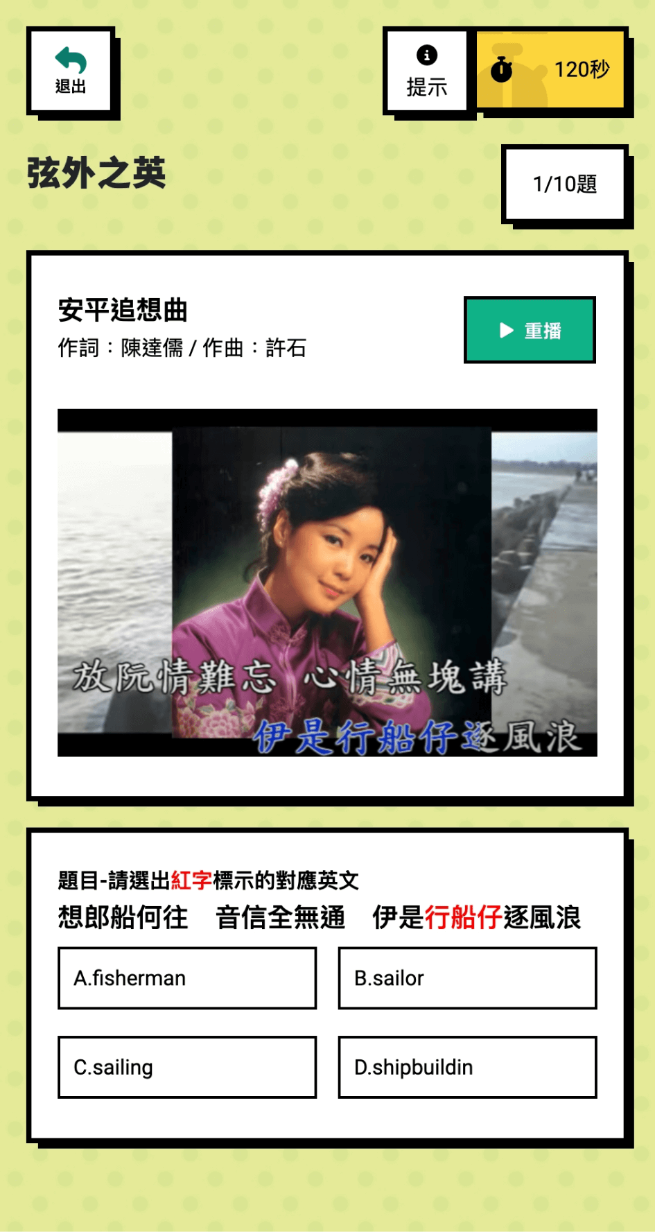 Listen to songs with a Taiwan flavor and challenge yourself to find the correct meaning from the lyrics.