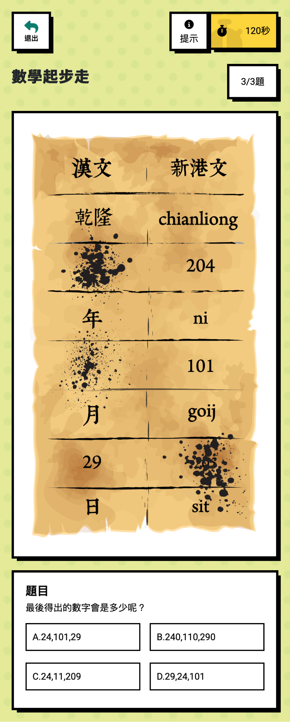 During the Dutch rule period (1624-1662), Dutch missionaries in Taiwan used the Roman alphabet to compile a dictionary of the aboriginal language for evangelism and assist in administrative affairs. They used the Roman alphabet to teach the local people to write their language, which was the Sinkang language. The Sinkang language was later used primarily in contract documents called “Sinkang Manuscripts.” Although Sinkang adopted the Latin alphabet and Arabic numerals, it did not adopt a numeral correspondence system. For example, in Sinkang Manuscripts, “365” is written as 300605 (300-60-5). The level’s primary purpose is to let players understand the application of Sinkang Manuscripts at that time.