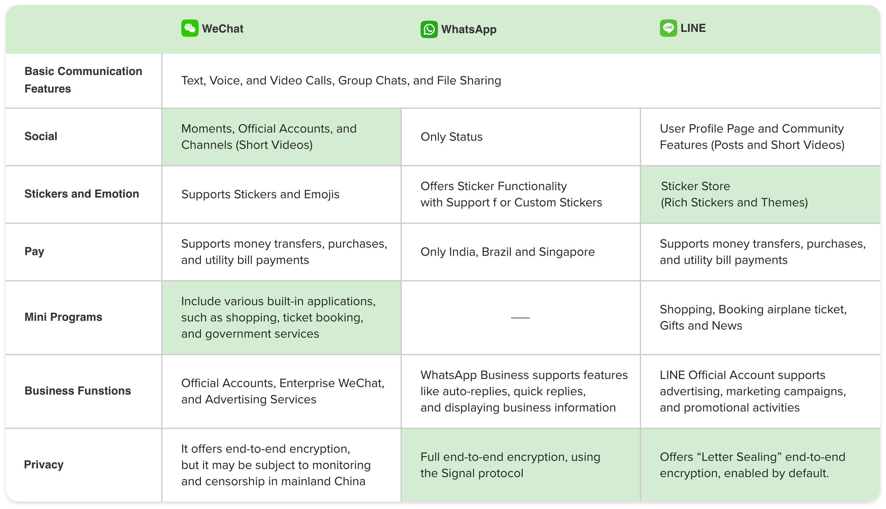 Analyze the functionalities and user experiences of WeChat in comparison with LINE and WhatsApp, aiming to uncover differences and potential opportunities for enhancement.