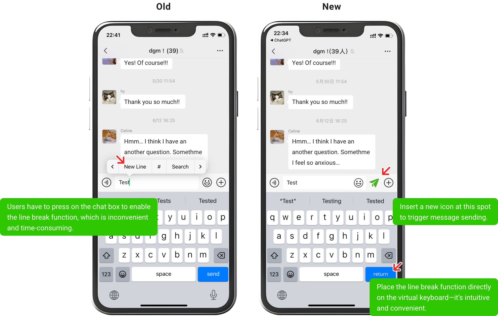 Currently, users must long-press to insert a line break, which several interviewees described as unintuitive.It is recommended to add a clearly visible line break button—either above the virtual keyboard or next to the input field—to reduce the learning curve and improve typing efficiency.