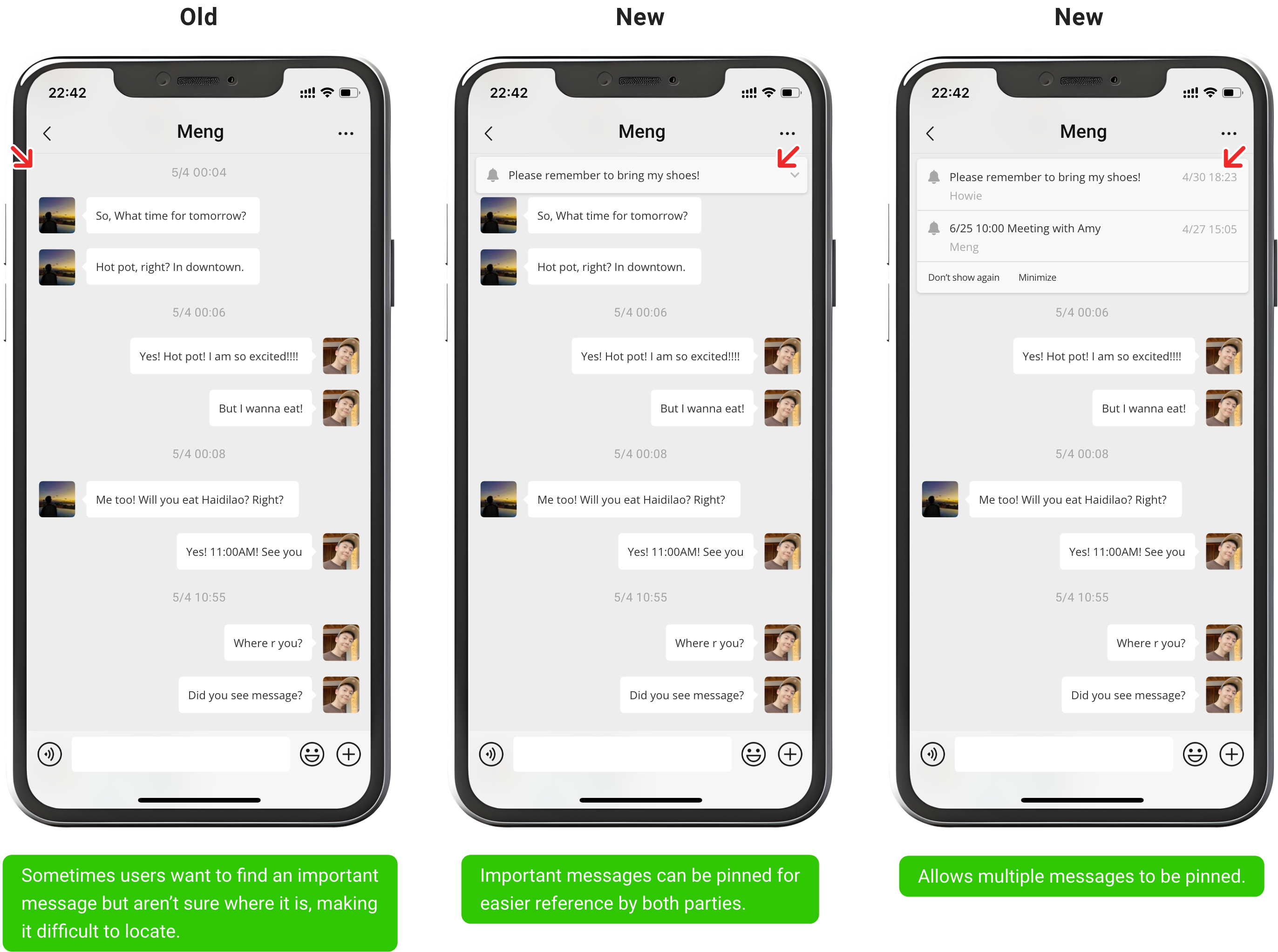 While 55% of users found this feature important, it is recommended to include a “Pin” option in the long-press message menu, along with guidance cues such as a tutorial for new users or tooltip prompts.